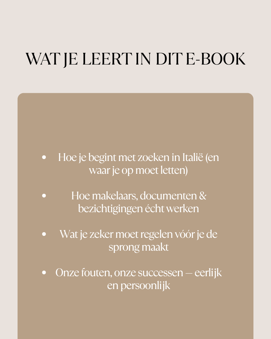 Voor slechts €14,99 ontvang je direct toegang tot dit e-book vol persoonlijke inzichten, praktische tips, valkuilen en checklists die wij in 2 jaar hebben verzameld tijdens ons emigratietraject naar Italië.