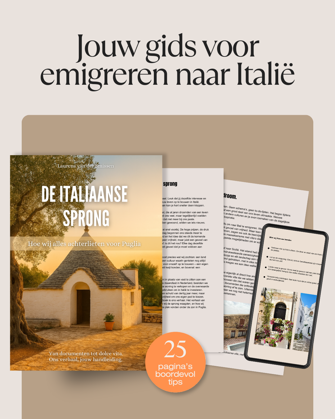 Voor slechts €14,99 ontvang je direct toegang tot dit e-book vol persoonlijke inzichten, praktische tips, valkuilen en checklists die wij in 2 jaar hebben verzameld tijdens ons emigratietraject naar Italië.
